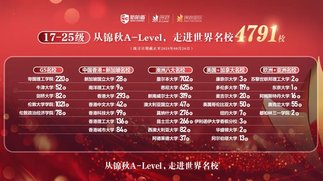 丰富成功案例:八年学生人数逾40000人,17-25年,从锦秋A-Level走进世界名 校所获offer4791枚。