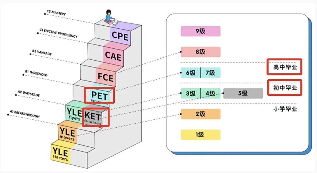 目前国内的中考、高考、大学英语的等级和难度的搭建,极大参考了剑桥英语体系。也就是说,国内中考的词汇量、考察方向和KET非常接近,而高考的词汇量、考察方向和PET也非常接近。