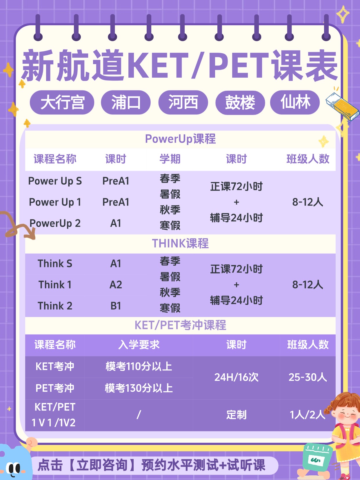 名额有限,感兴趣的家长赶紧咨询哦!欢迎找新航道南京ket培训小编给孩子预约试听课!