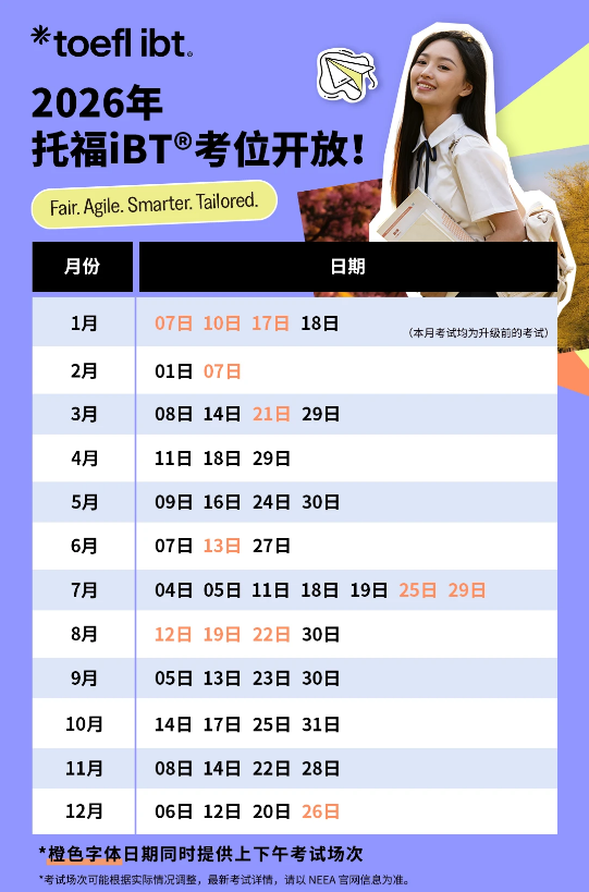 2026年托福考试从1月持续至12月,每月均设多个考试日期,方便考生根据自身节奏安排备考。值得注意的是,1月的考试均为升级前的考试,这意味着从2月起,考生将体验到最 新版本的托福iBT考试。