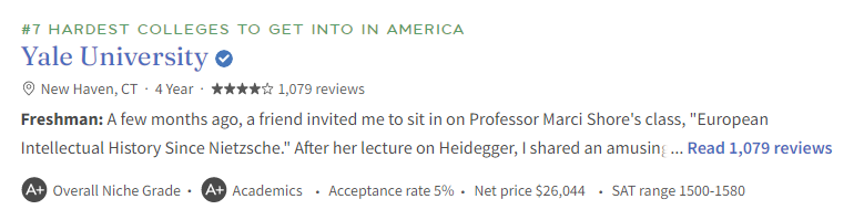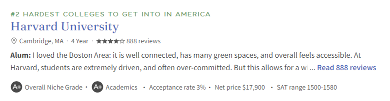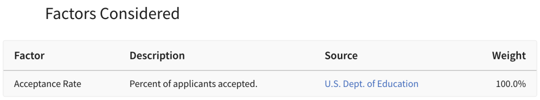 评选因素:Niche这一排名的评判指标仅仅考虑了录取率(也就是被录取的申请者在申请者总数中所占的百分比)这一项内容。