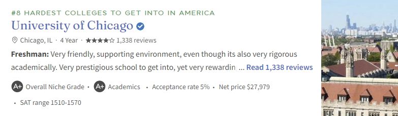 芝加哥大学的申请竞争异常激烈,被录取学生的平均学业成绩点数(GPA)通常处于3.8至4.0的区间,平均值达到3.95。在满足学术方面的要求之后,申请人还需在申请材料的其他部分给招生官员留下极为深刻的印象。近年来,芝大不仅整体录取率显著降低,而且更倾向于在提前申请阶段锁定学生,去年共有53名中国学生在ED0(极早期决定,部分学校特有申请批次)和ED1(早期决定第 一轮)阶段收获录取通知。