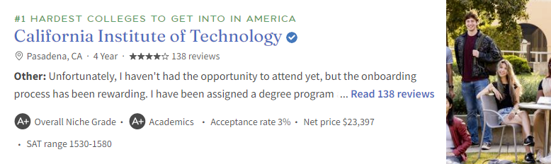 加州理工学院长期稳居美国最难申请入读大学排行榜的首位,该校规模虽不大,但录取标准极为严苛,每年仅招收200 - 250名本科学生。能获得加州理工学院的录取通知书,在理工科领域简直可以“称霸一方”!其对标化成绩的要求苛刻到无人能比,申请者需将分数维持在1530 - 1580这个区间!加州理工学院2028届仅录取了315名学生,相较于去年的412人,减少了近百人,其中有9名中国学生拿到了录取通知。