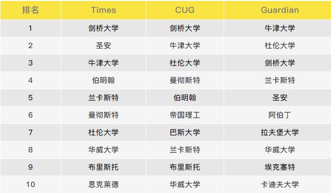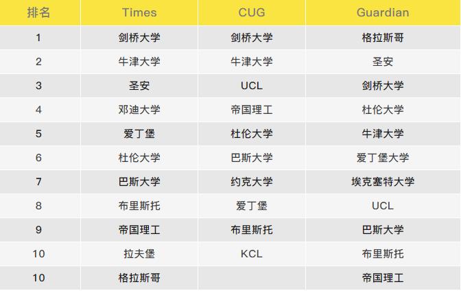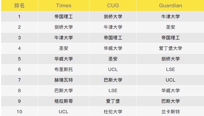 针对申请英国本科理科方向(涵盖化学、数学、物理、地理、生物等学科)的同学,以下院校在Times、CUG及Guardian三大权威榜单的学科分类排名中均位列前十,供大家择校参考。