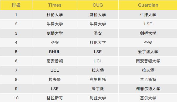 分别在三大排名的“地理”科目中,位列前10的英国大学有