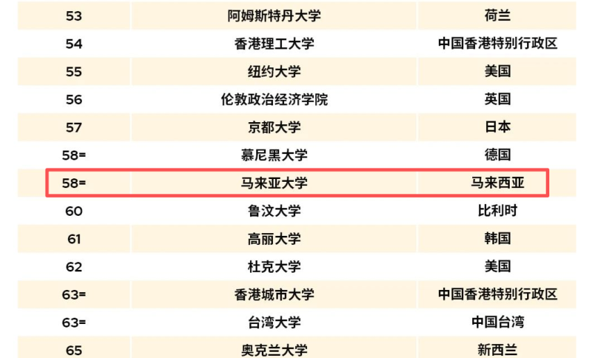 马来亚大学是马来西亚排名第 一的高校,在最 新公布的2026QS世界大学排名中,马来亚大学位列全球第58名,亚洲排名15位。