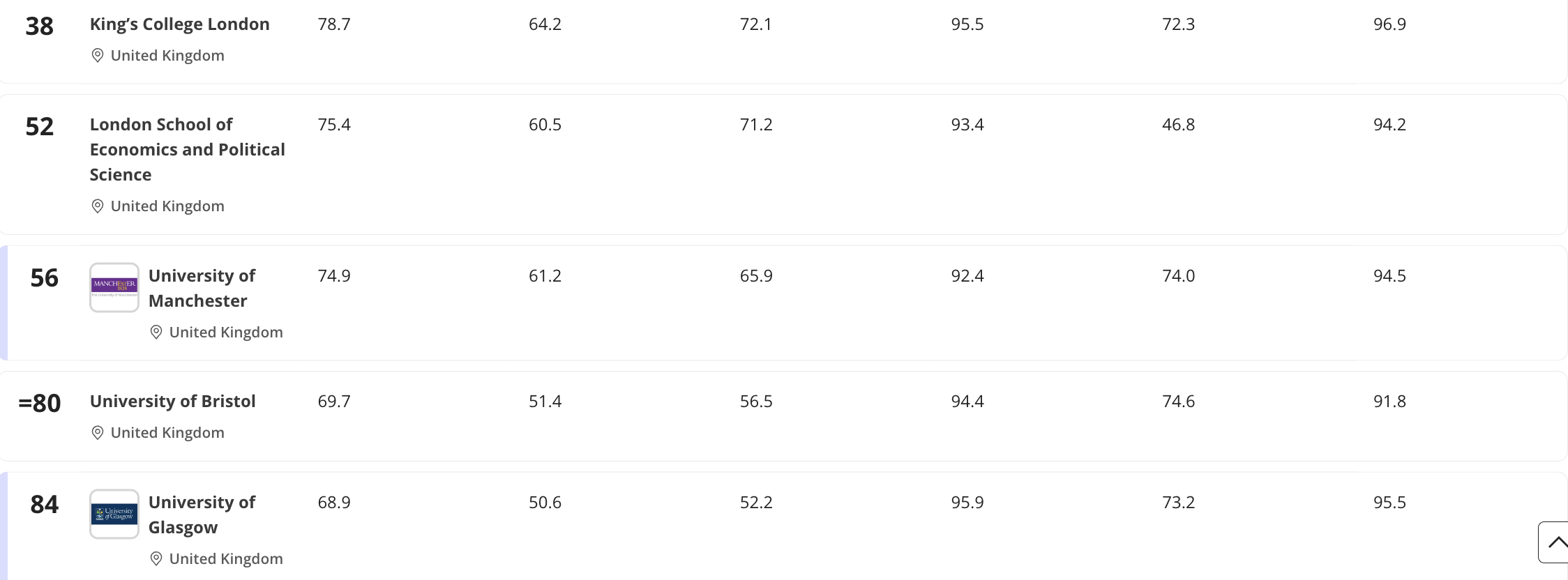 作为英国G5院校的另外两所高校:伦敦大学学院(UCL)位列全球第22名,与去年持平; 而伦敦政治经济学院(LSE)今年再降2位,仅排名全球第52名。