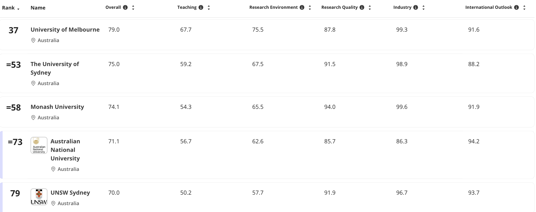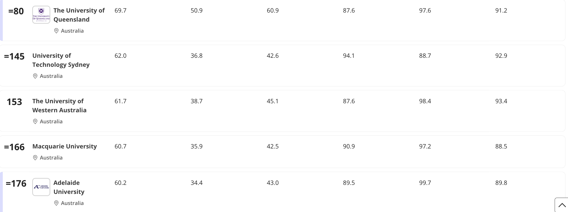 6所澳大利亚院校进入全球前100:墨尔本大学(37)、悉尼大学(53)、蒙纳士大学(58)、澳大利亚国立大学(73)、新南威尔士大学(79)、昆士兰大学(80)。
