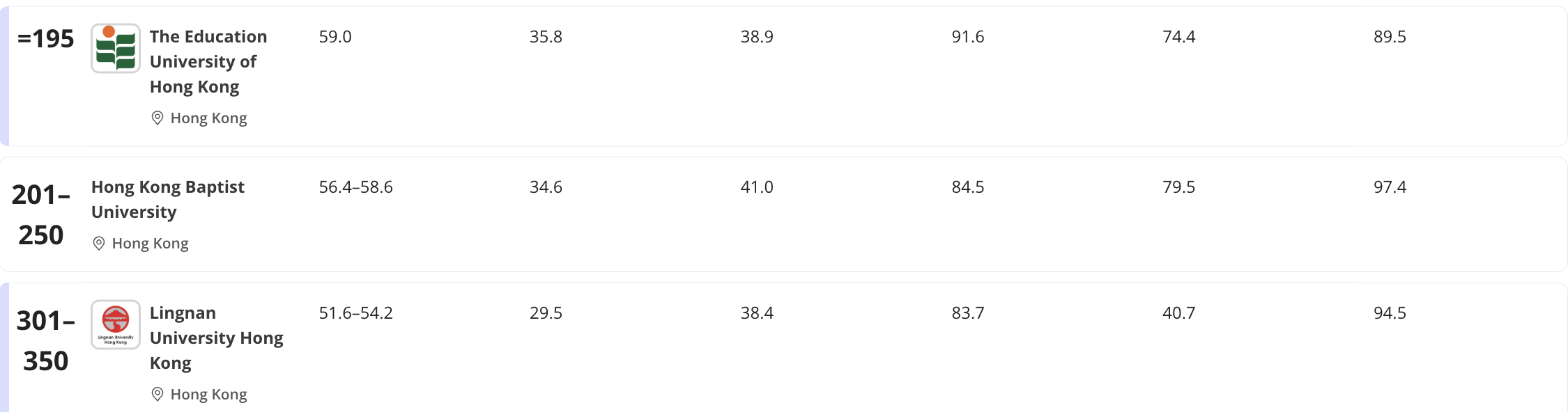 5所中国香港院校进入全球前100名:香港大学(33)、香港中文大学(41)、香港科技大学(58)、香港城市大学(75)、香港理工大学(83)。