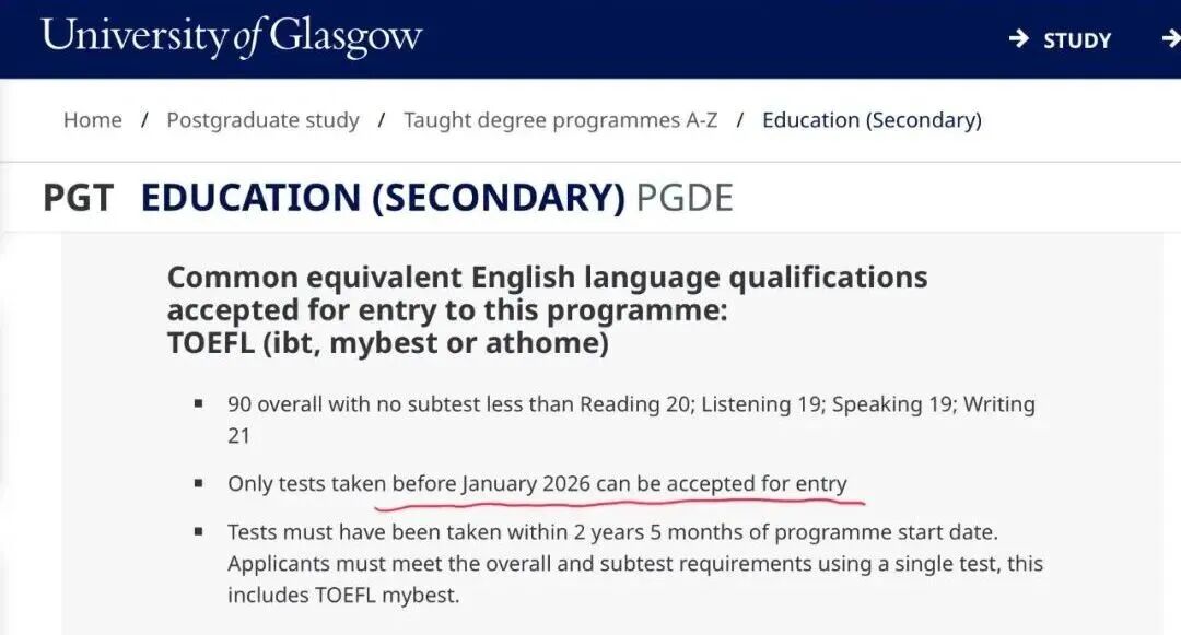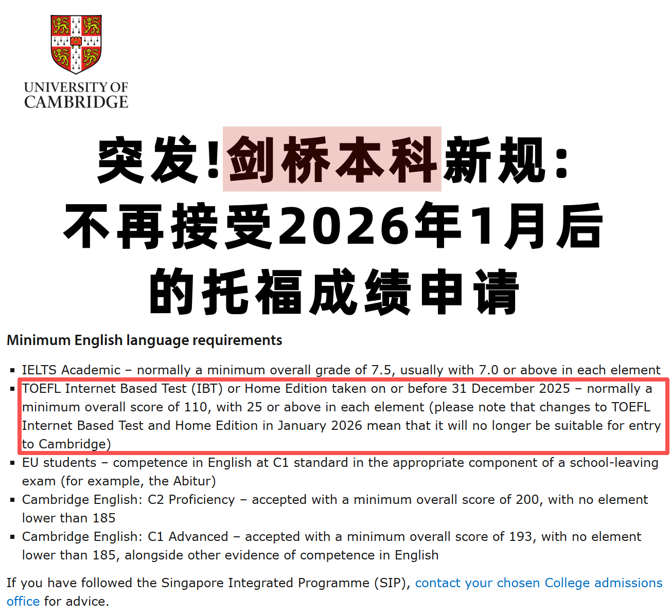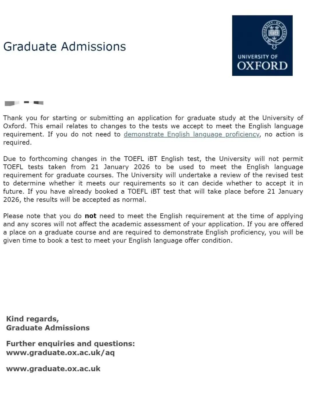 牛津大学通过官方邮件及官网入学语言要求公告正式声明:自2026年1月21日起,将不再承认新版托福网考(TOEFL iBT)成绩作为研究生课程的语言能力资质证明。