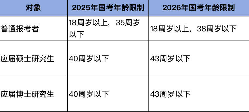 从公告显示,2026年国考考生年龄标准普遍扩展到38周岁以下,对2026年应届毕业生中的硕士、博士研究生,标准放宽至43周岁以下。