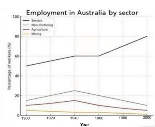 The line graph illustrates changes in the percentage of people working in four sectors(service, manufacturing, agriculture, and mining) during the period from 1900 to 2000.